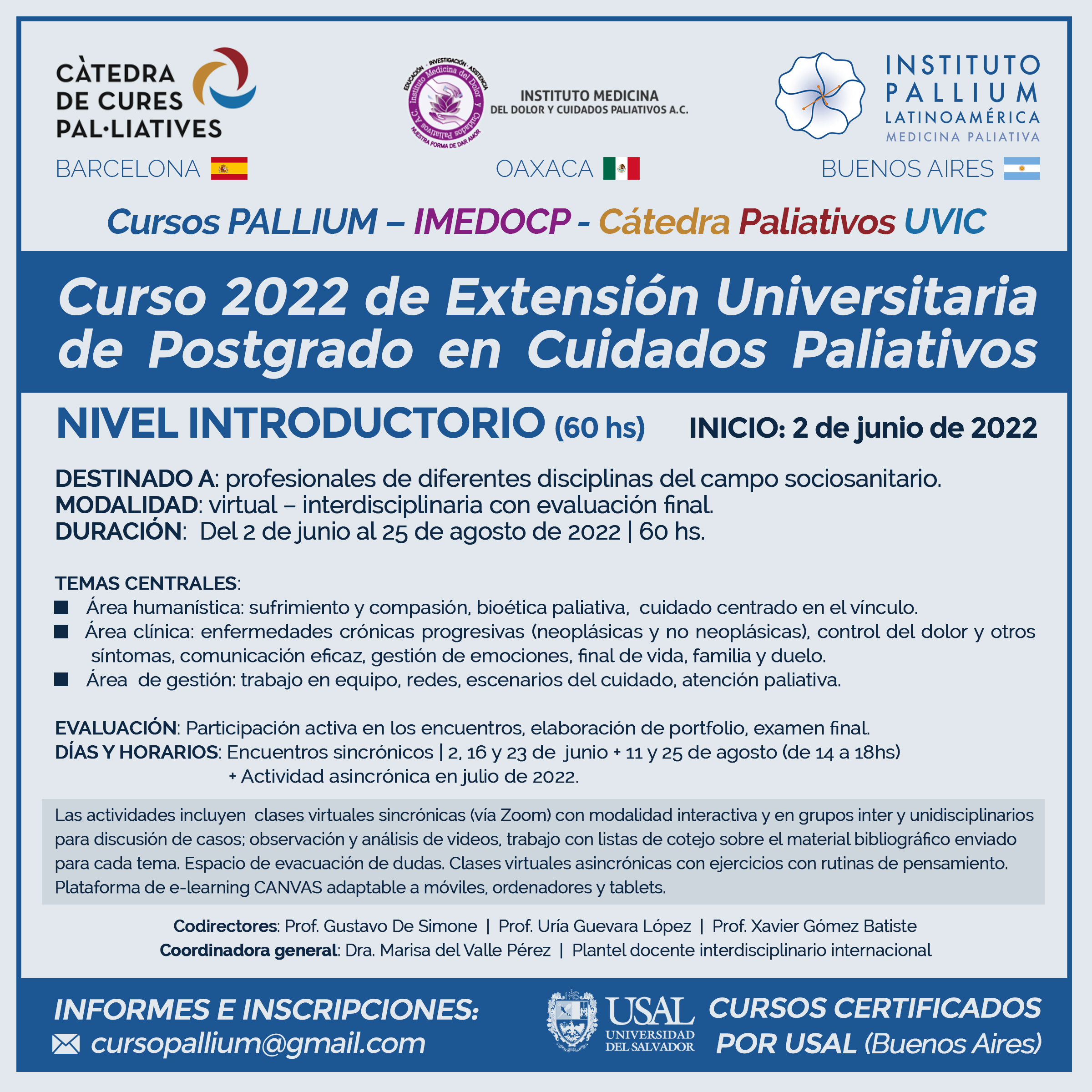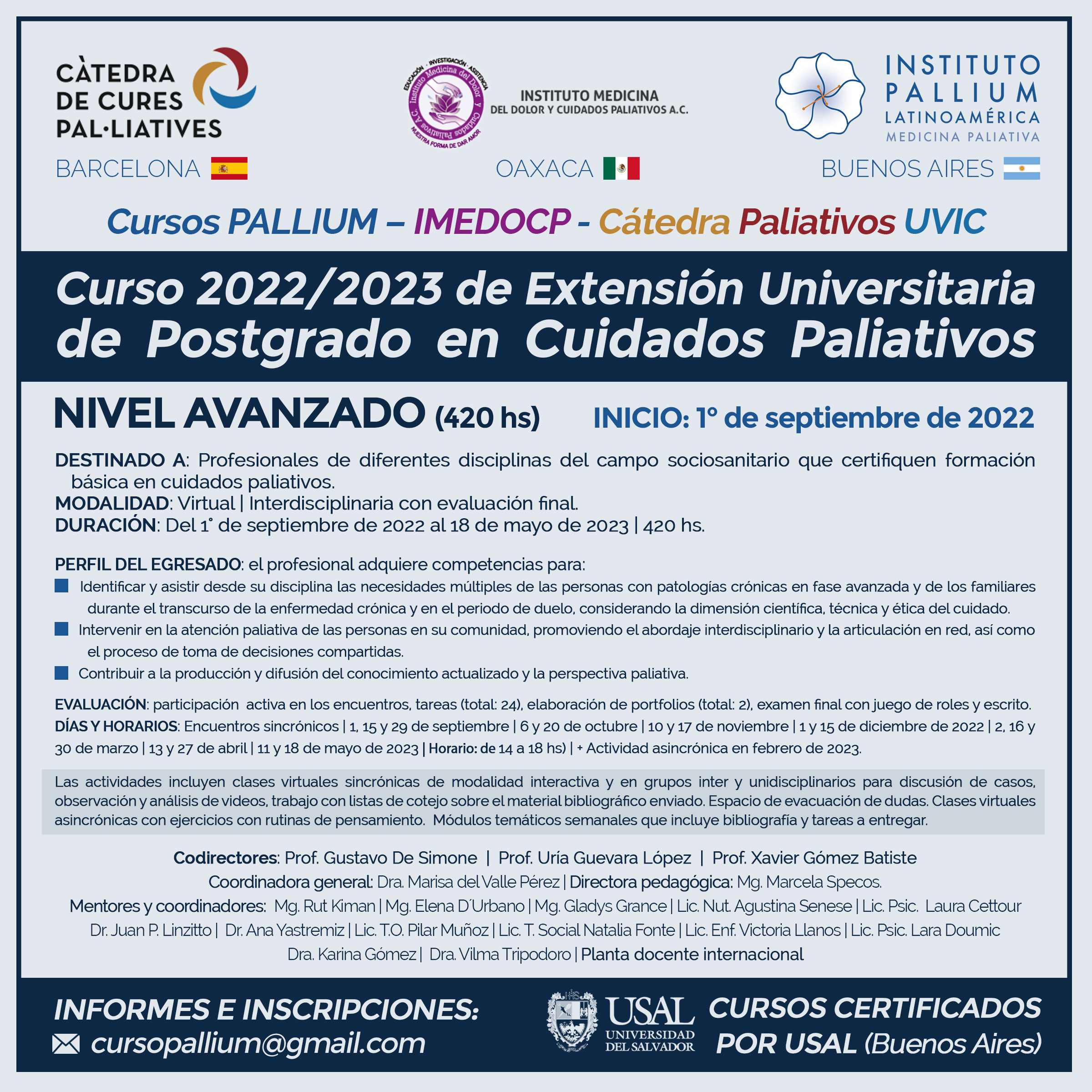 Desde 1993 Pallium ha impulsado el desarrollo de los Cuidados Paliativos a través de sus cursos de actualización de postgrado en Cuidados Paliativos y Psico-socio-oncología, contando desde el 2001 con el certificado de la Escuela de Medicina de Postgrado de la Universidad del Salvador. Desde 2022, Pallium une esfuerzos con el Instituto Medicina del Dolor y Cuidados Paliativos A.C. (Oaxaca, México) y la Cátedra de Cures Pal-Liatives de la Universidad de VIC (Catalunya) y nuestros Cursos de Postgrado en Cuidados Paliativos son ahora: Cursos PALLIUM – IMEDOCP – Cátedra Paliativos UVIC.