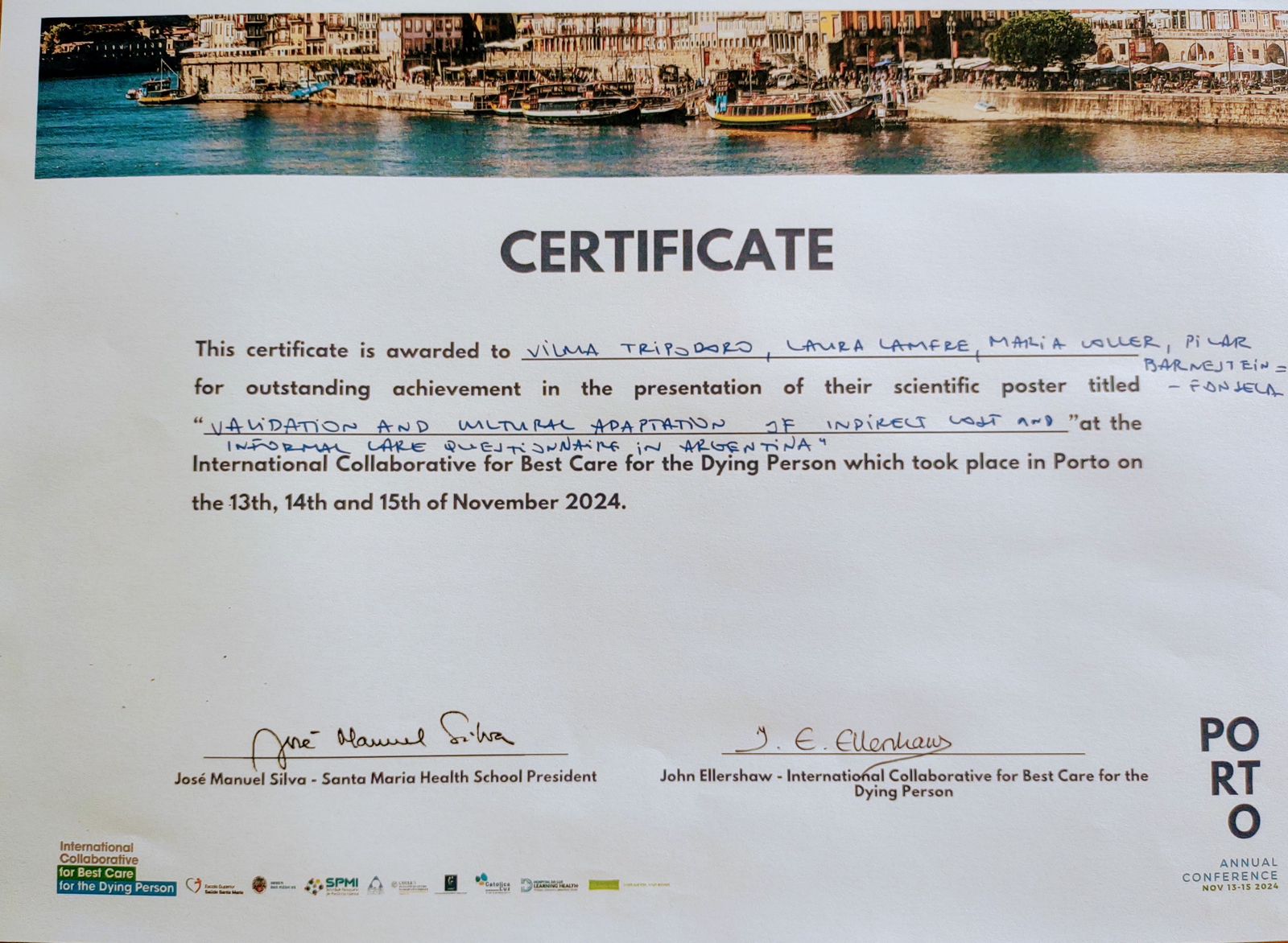 Allí presentó los avances del Programa PAMPA en Argentina y fue galardonada con el primer premio al mejor póster con el trabajo “Validación y adaptación transcultural del cuestionario de Costo Indirecto y del Cuidado informal (CIIQ) de pacientes en los seis últimos meses de vida” (Lamfre L, Coller M, Barnenstein P y Tripodoro V) que forma parte del Proyecto iLIVE.